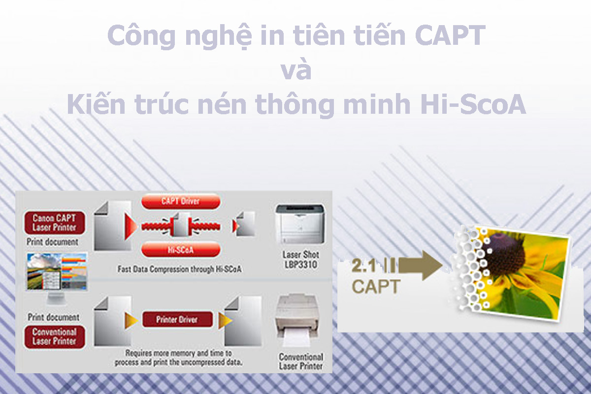 Vận dụng sức mạnh từ công nghệ in tiên tiến CAPT và kiến trúc nén thông minh Hi-ScoA, thiết bị này có thể xử lý các dữ liệu hình ảnh nhanh hơn các máy in thông thường bằng cách nén dữ liệu in vào một kích thước nhỏ hơn để có thể nhanh chóng truyền dữ liệu đó từ máy tính sang máy in có CAPT. Tính năng này giúp tăng tốc độ in mà không phải nâng cấp bộ nhớ máy in.